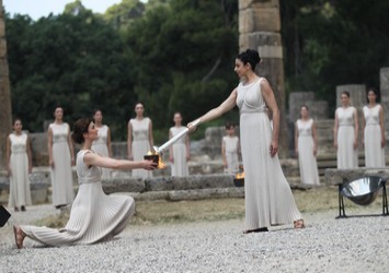 Η πρωθιέρεια Ινώ Μενεγάκη με τη δύναμη των αχτίδων του ήλιου και τη βοήθεια του κατόπτρου άναψε την Ολυμπιακή Φλόγα και τη μεταλαμπάδευσε στη δάδα του παγκόσμιου πρωταθλητή της κολύμβησης Σπύρου Γιαννιώτη, με τον οποίο άρχισε η Λαμπαδηδρομία.
